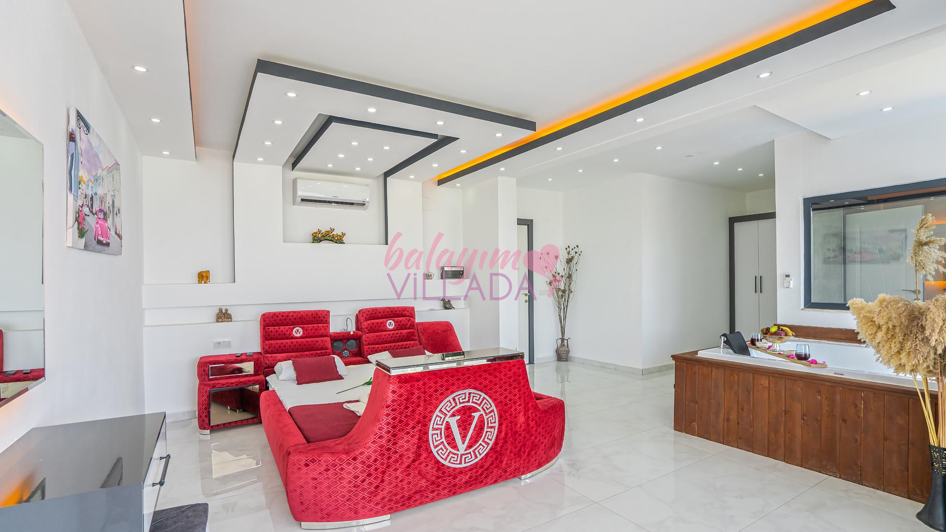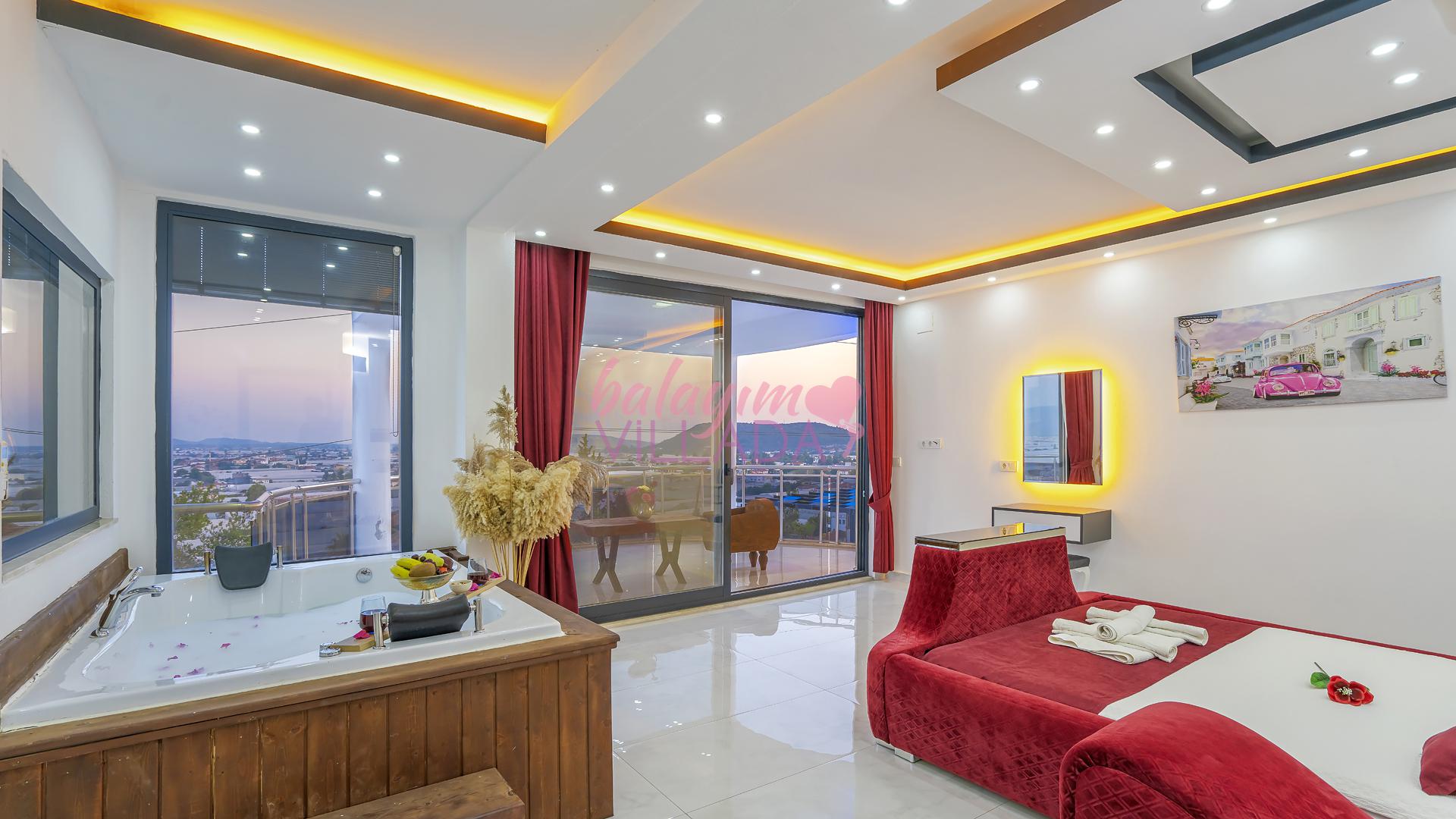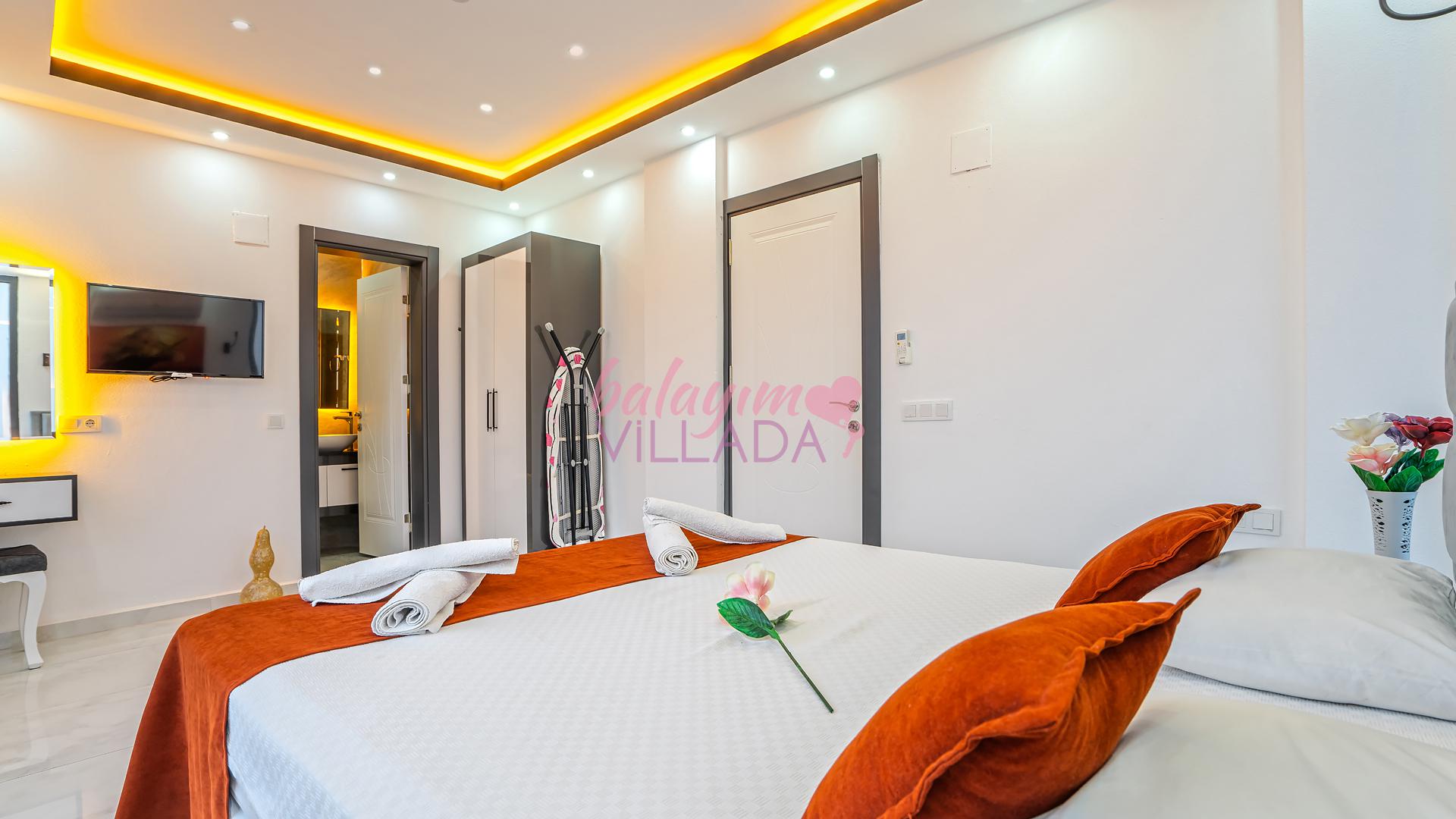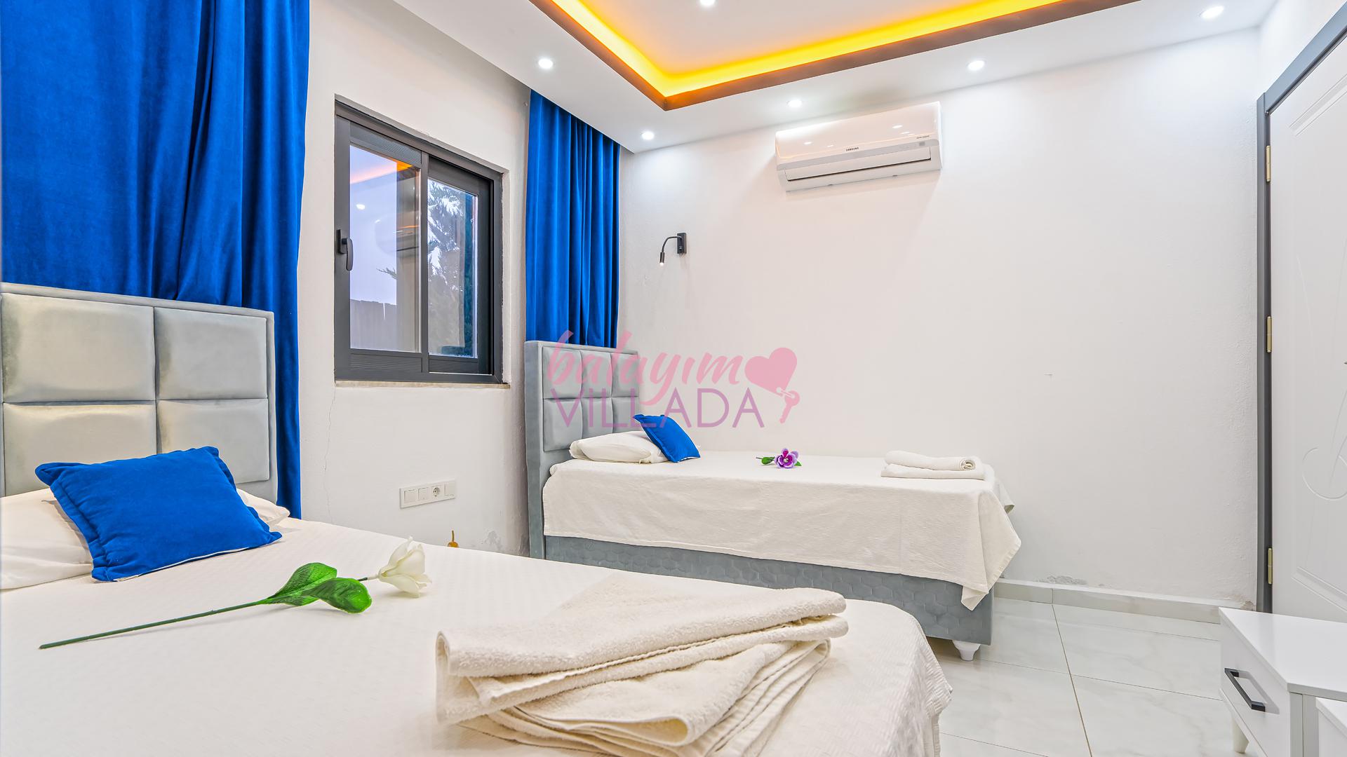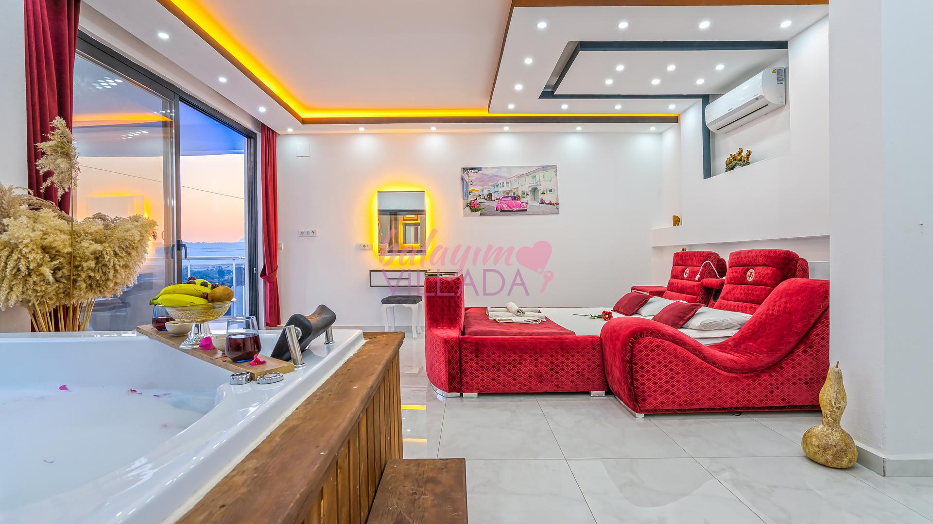 Romantik Detaylarla Arınma: Ebeveyn yatak odasında yer alan şık jakuzi, tatilinizi bir spa deneyimine dönüştürürken; villanın modern tasarımı her anınızı özel hissettirecek.