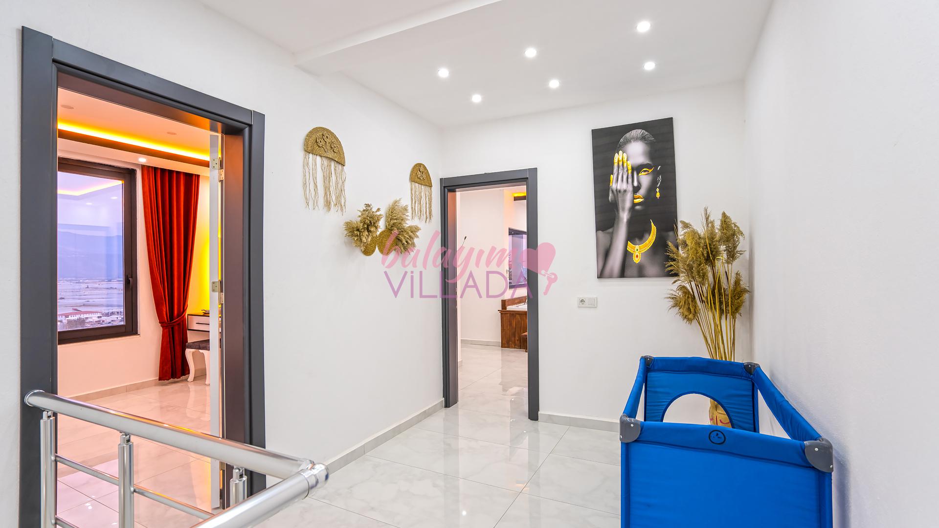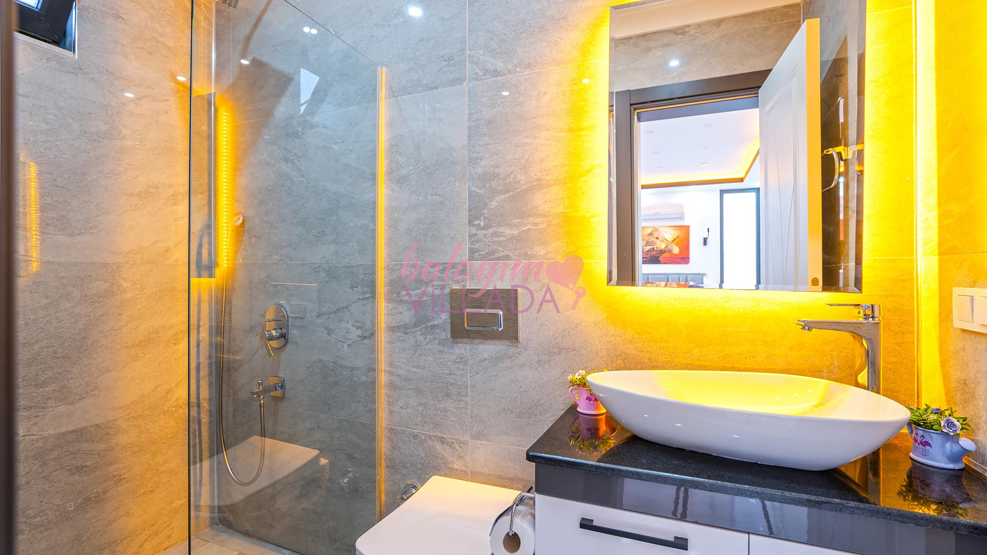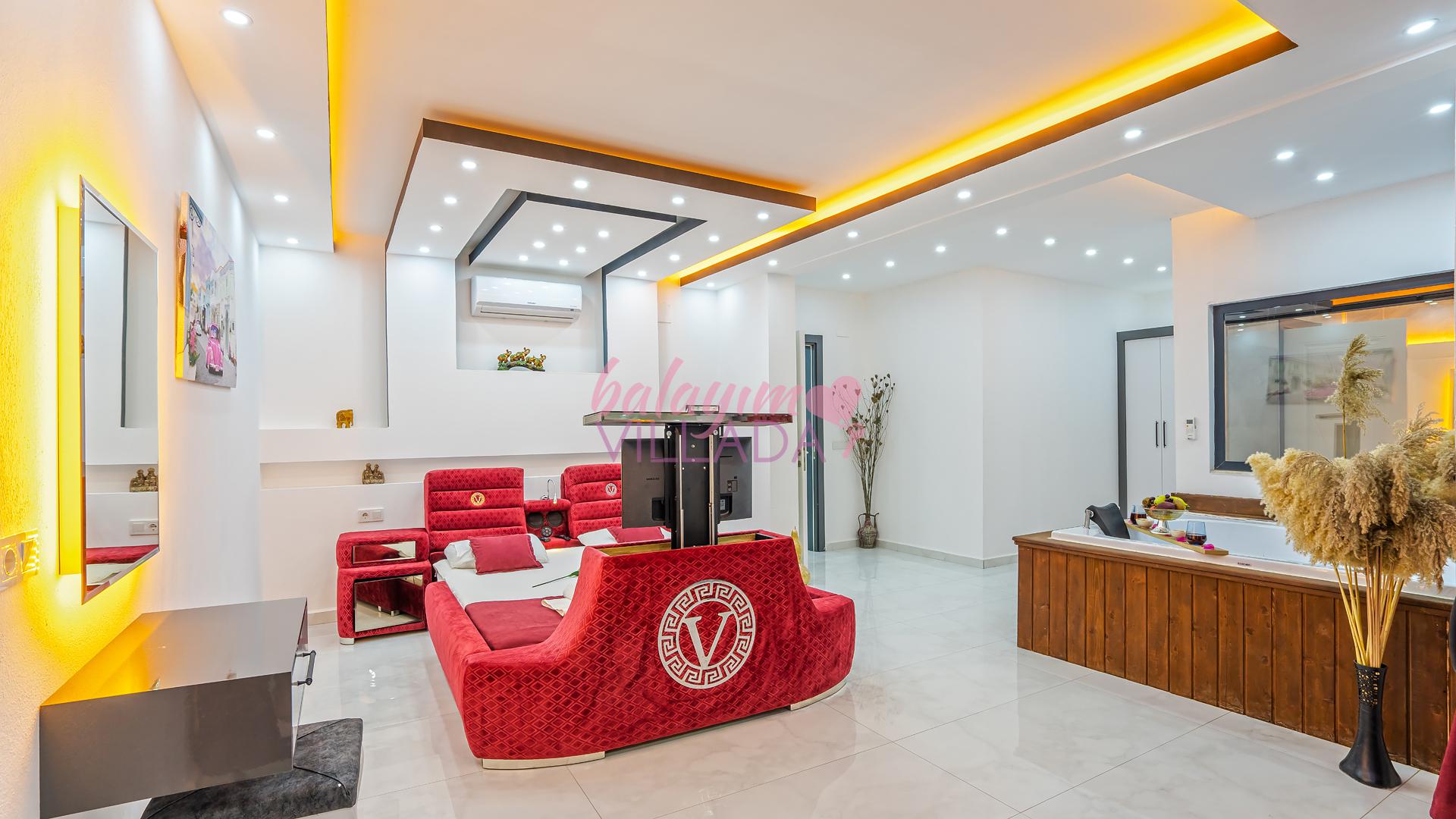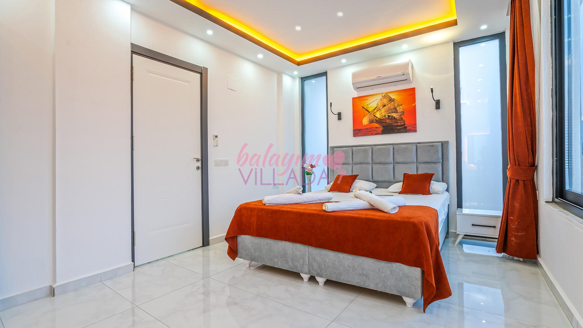 Romantik Detaylarla Arınma: Ebeveyn yatak odasında yer alan şık jakuzi, tatilinizi bir spa deneyimine dönüştürürken; villanın modern tasarımı her anınızı özel hissettirecek.
