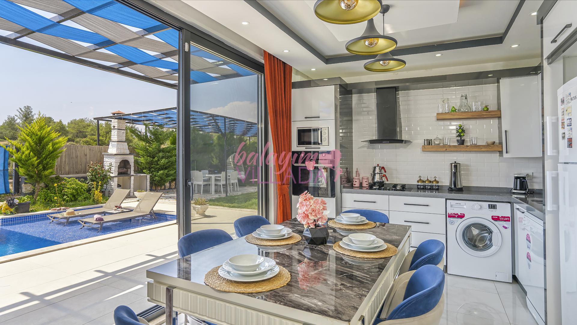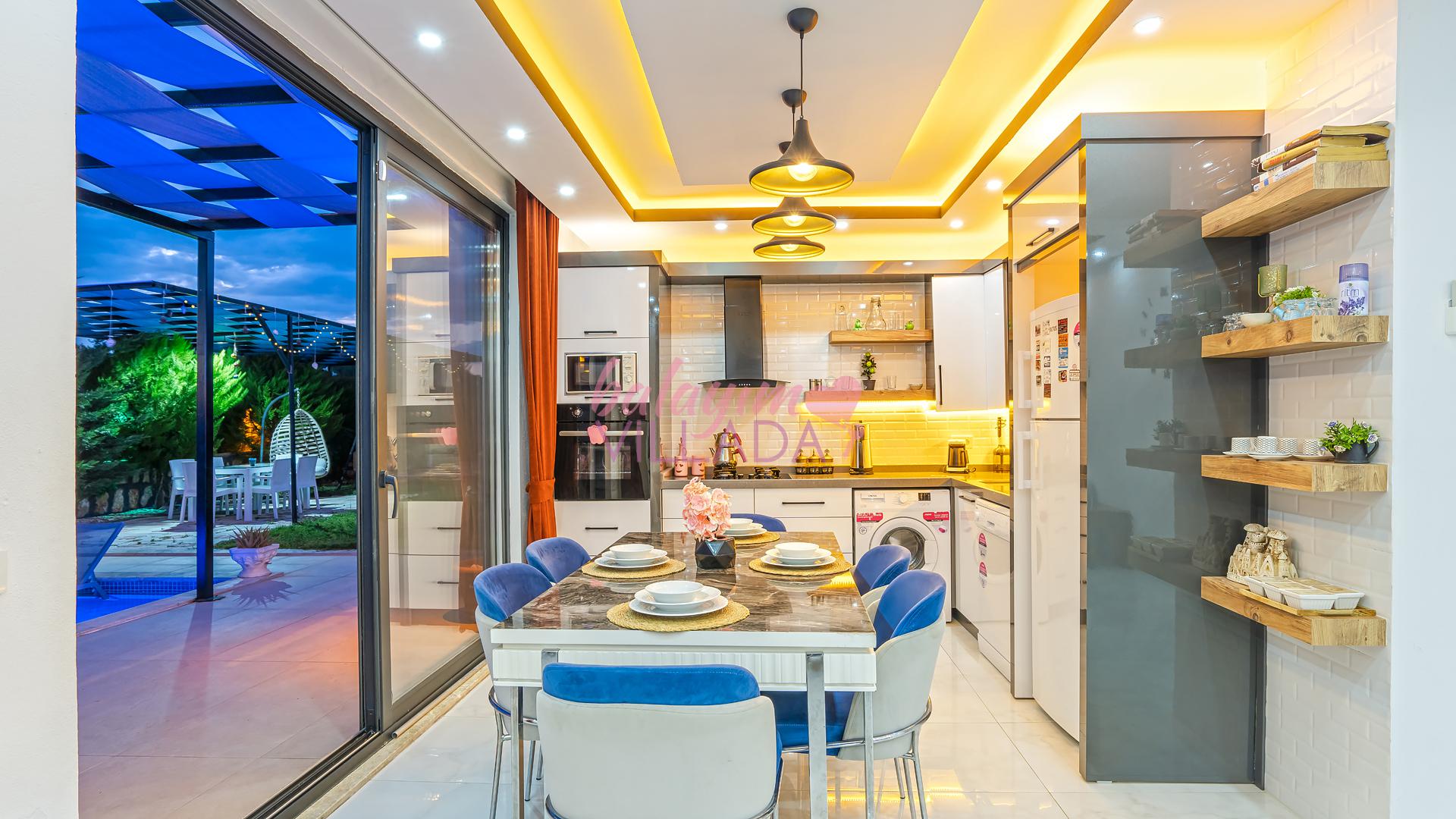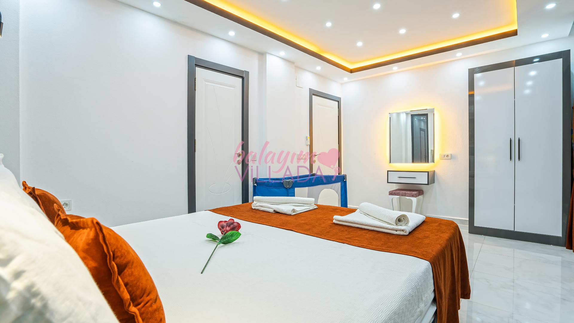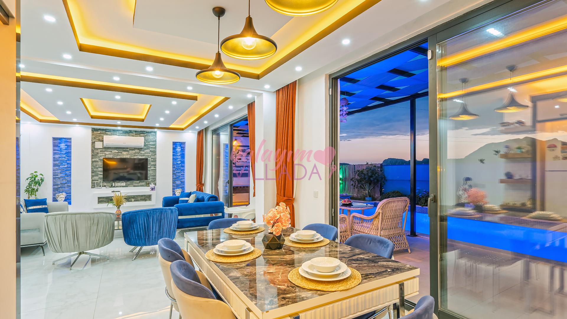 Modern ve Ferah Tasarım: Şık mobilyalarla döşenmiş iç mekanları ve geniş bahçe alanı ile balayınızda konforu ve lüksü her an hissedeceksiniz.