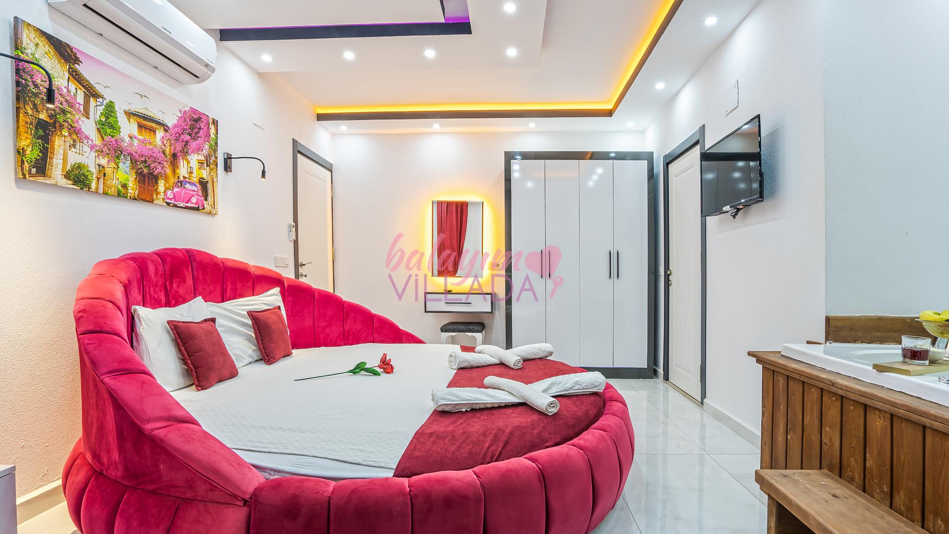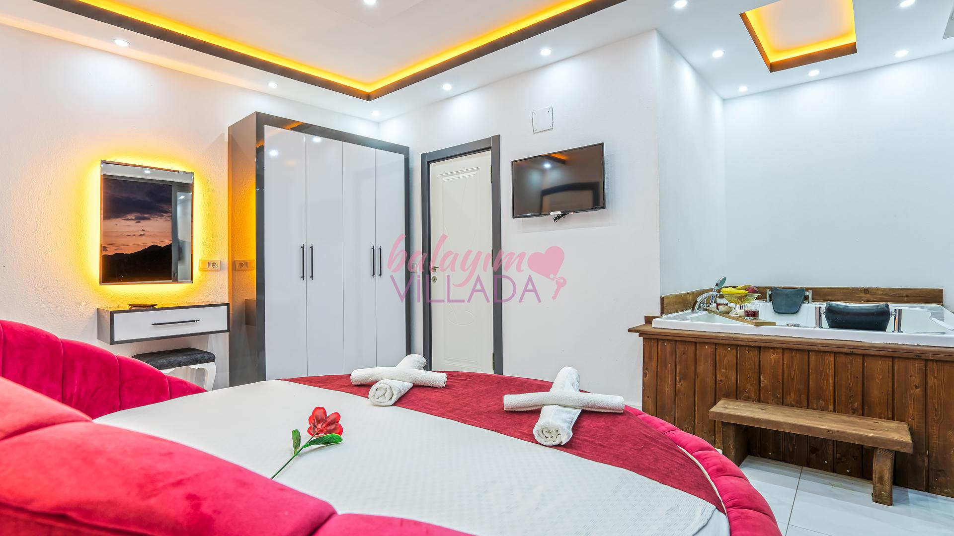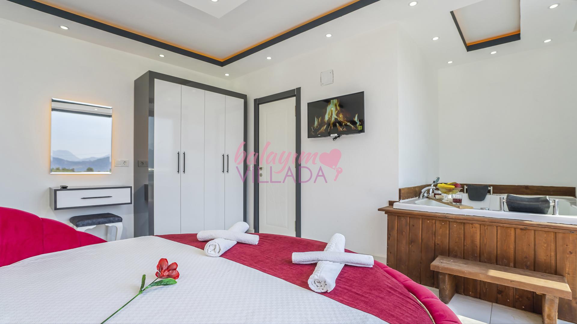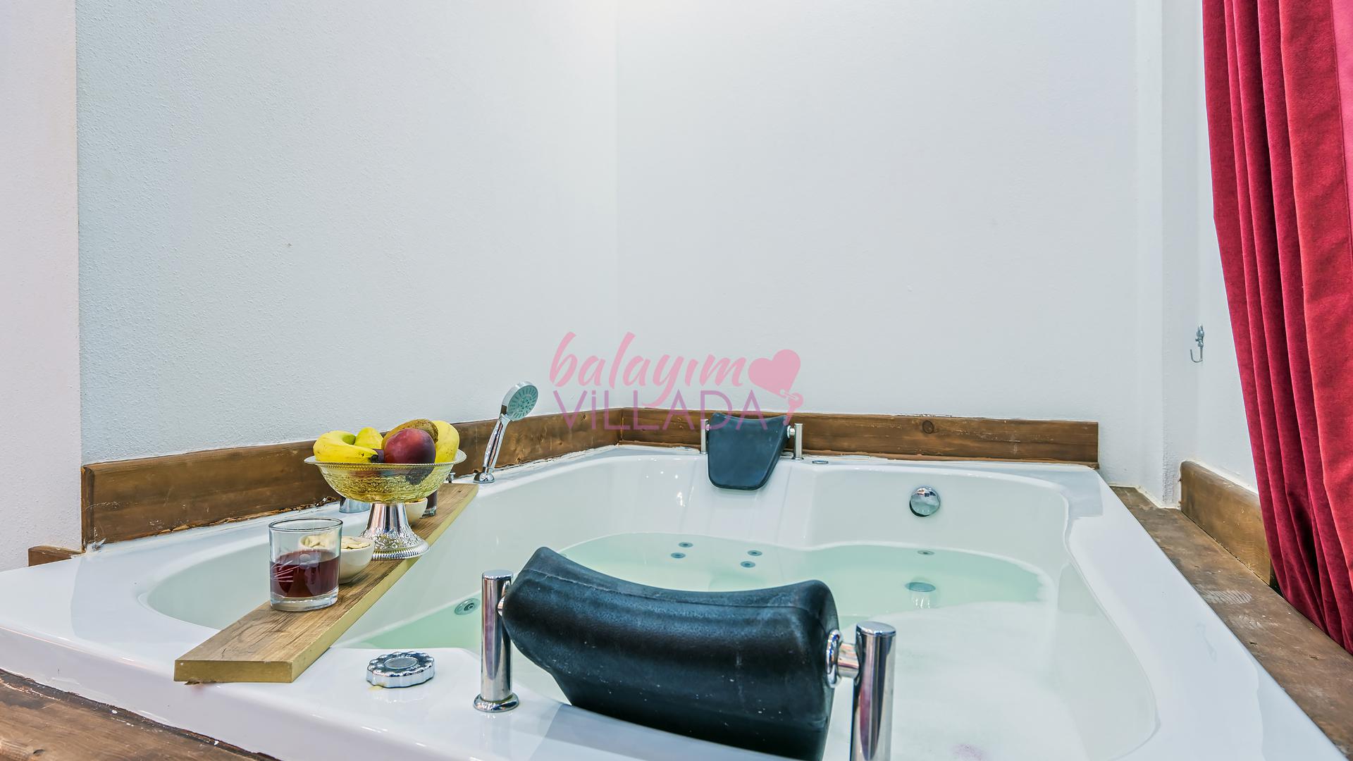Romantik Jakuzi Keyfi: Ebeveyn yatak odasında yer alan şık jakuzi, gün boyu süren tatlı yorgunluğunuzu romantik bir atmosferde atmanız için sizi bekliyor.
