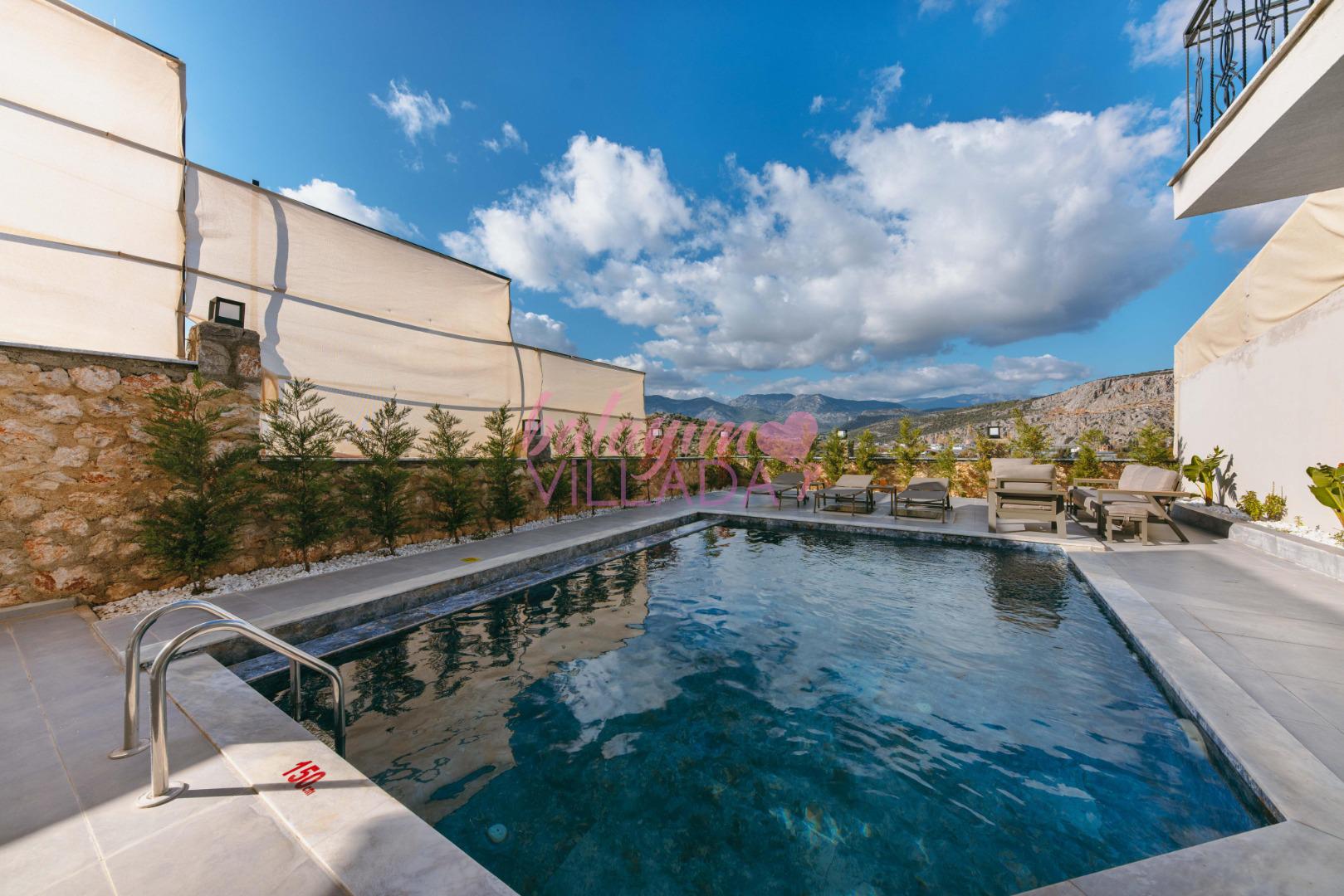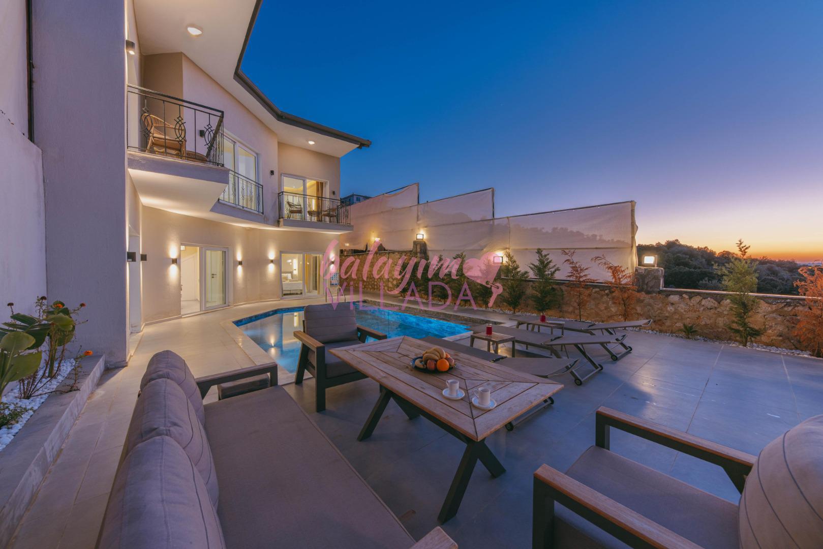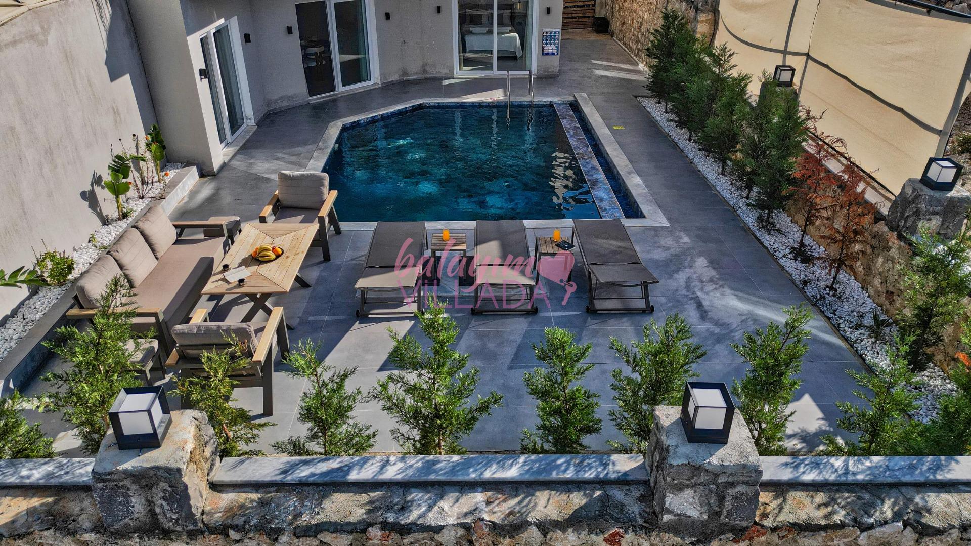 Teras Keyfi: Havuz başındaki modern oturma grubunda, yıldızların altında romantik akşamların tadını çıkarın.