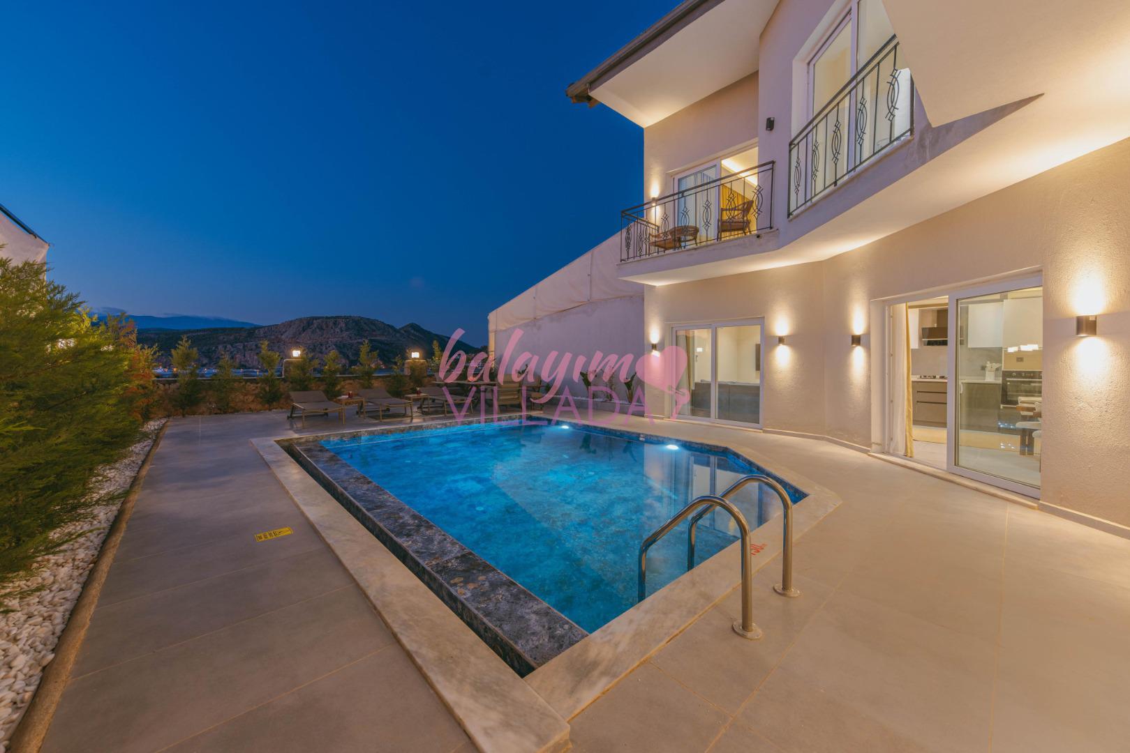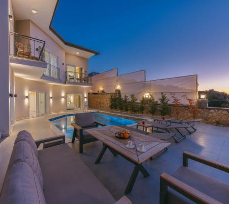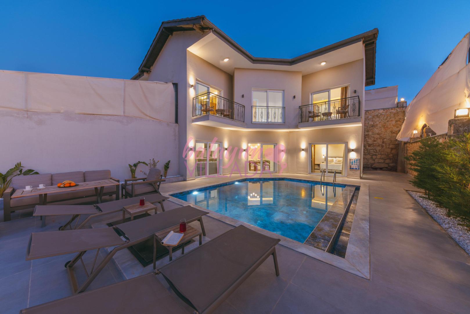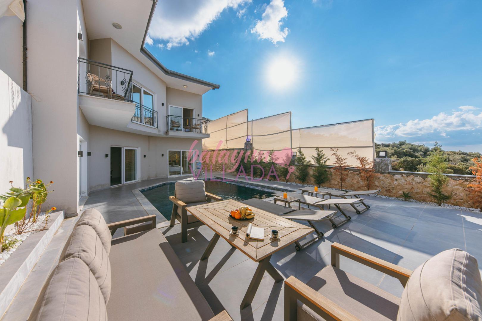 Teras Keyfi: Havuz başındaki modern oturma grubunda, yıldızların altında romantik akşamların tadını çıkarın.