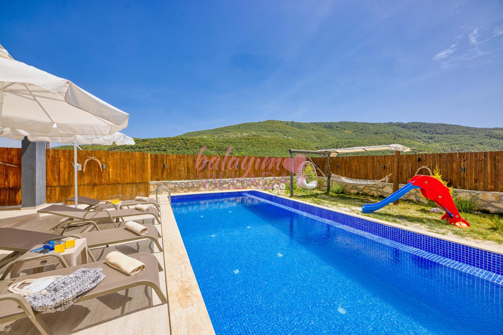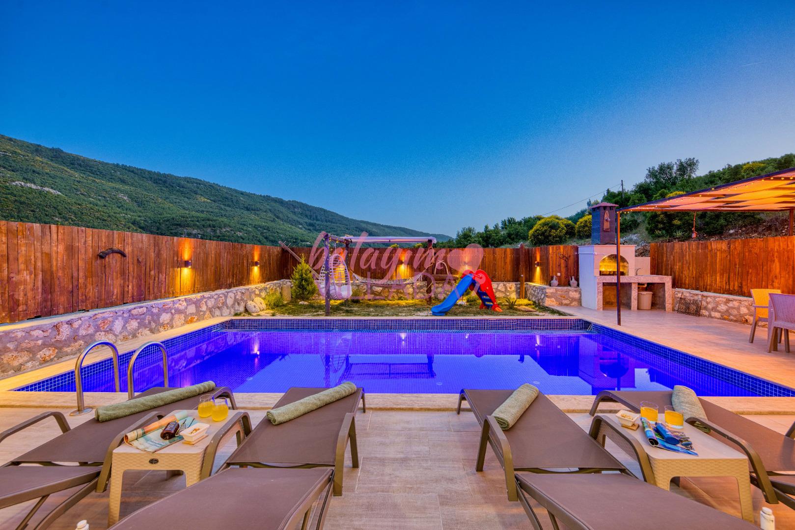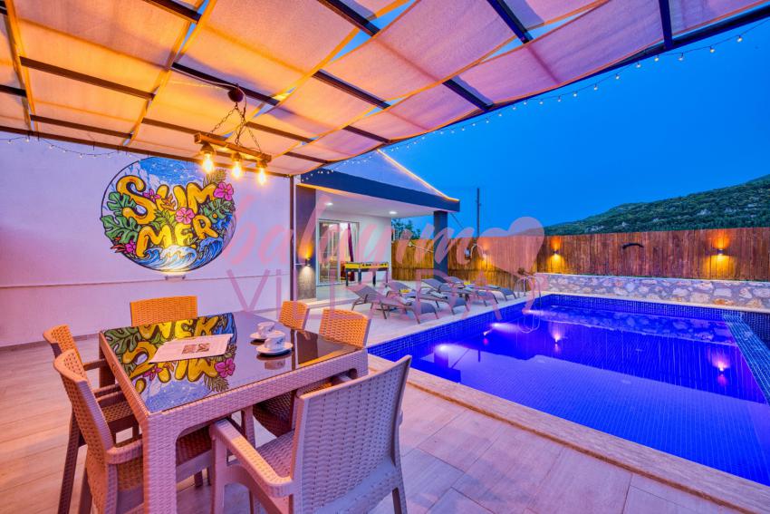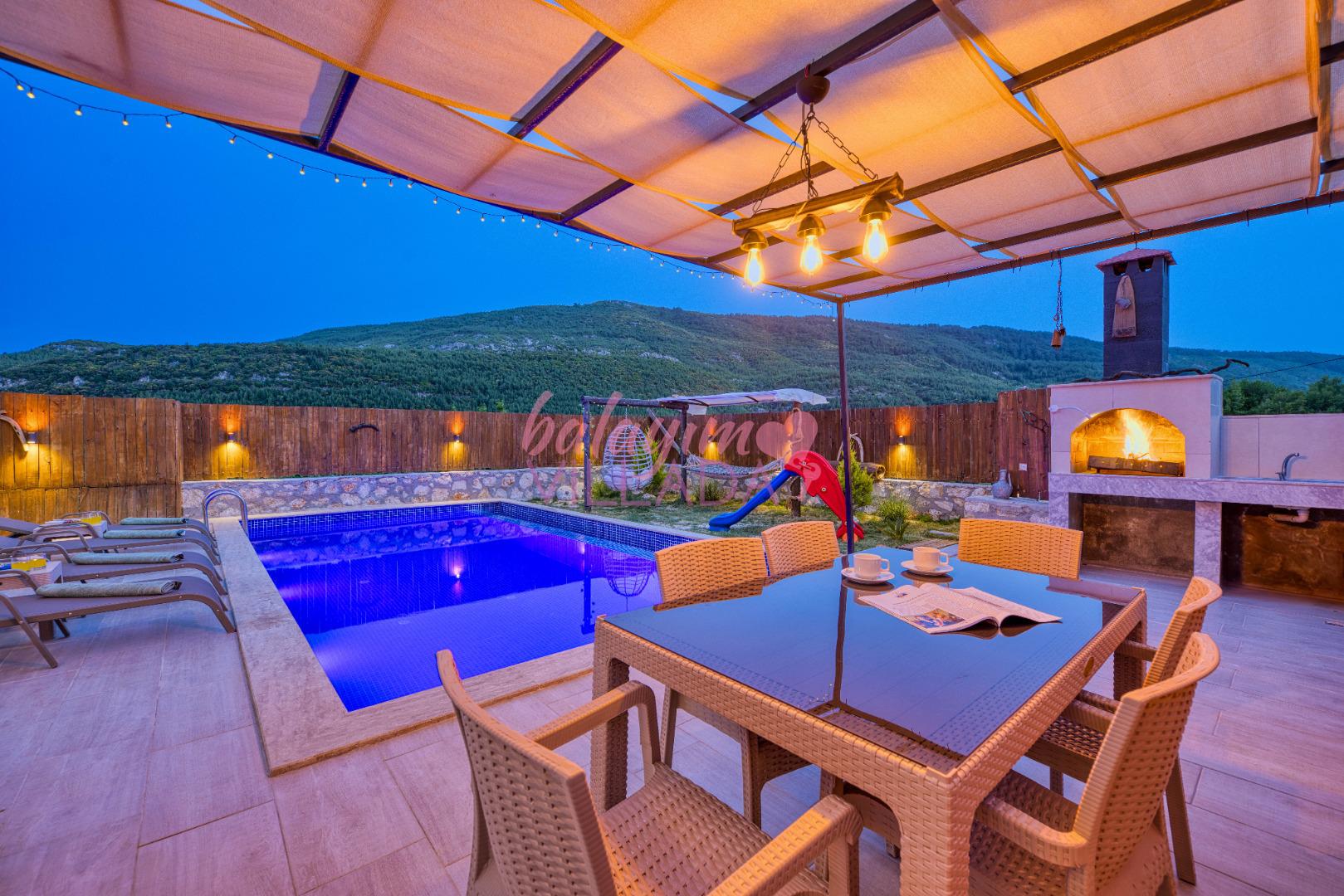 Villa Atakan Hacıoğlan, Kalkan Hacıoğlan mevkiinde bulunan havuzu korunaklı kiralık balayı villamızdır. Havuzunun korunaklı olması sayesinde gözlerden uzakta tatil yapmak isteyen çiftlerimiz için ideal bir seçenektir. Doğa içerisinde konumu olan villamı Kalkan merkeze yaklaşık 25-30 dk uzaklıktadır.