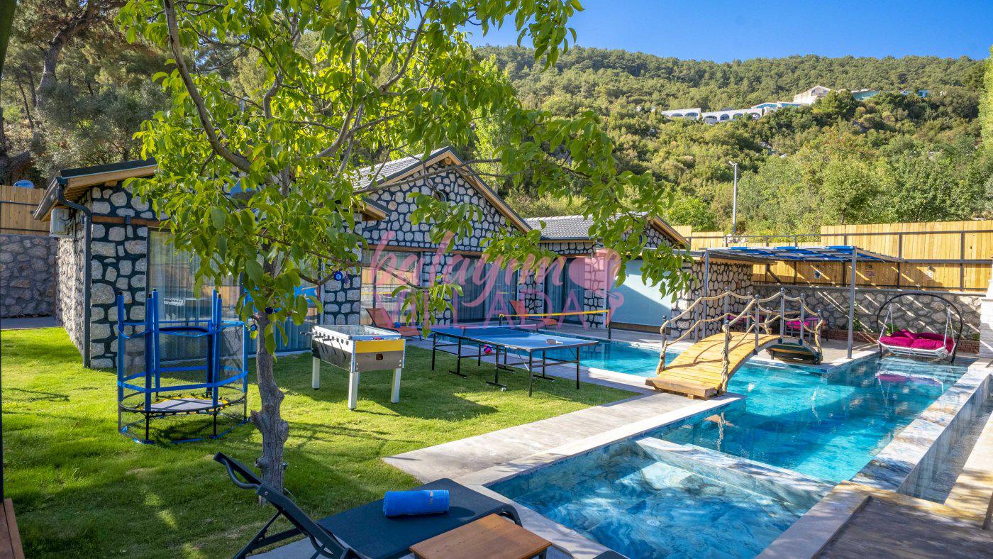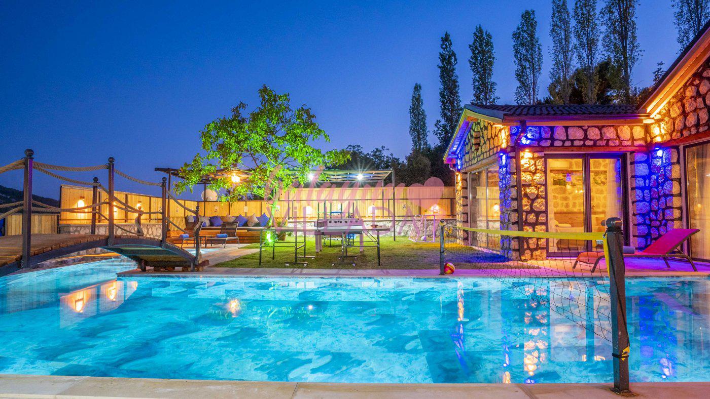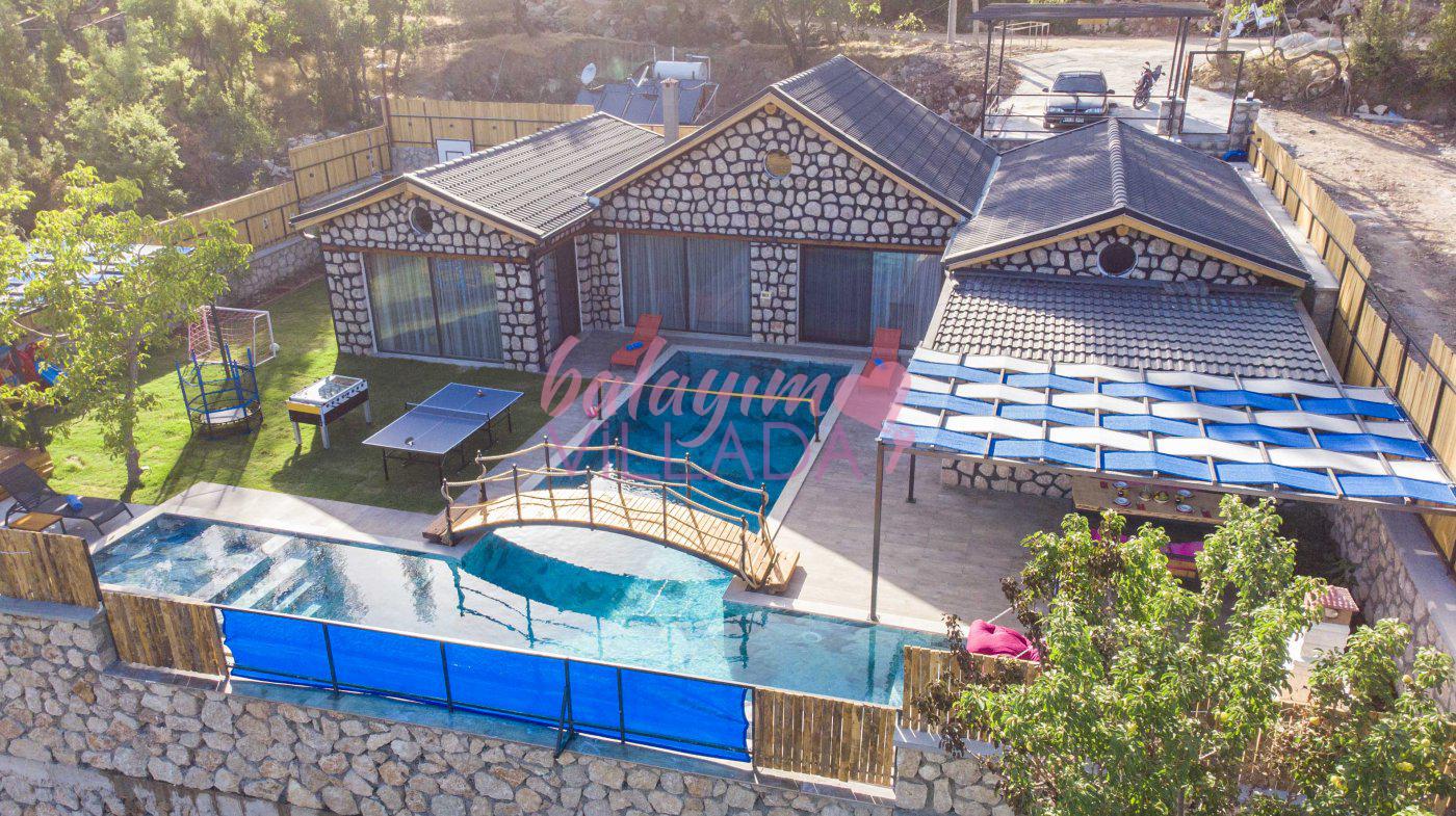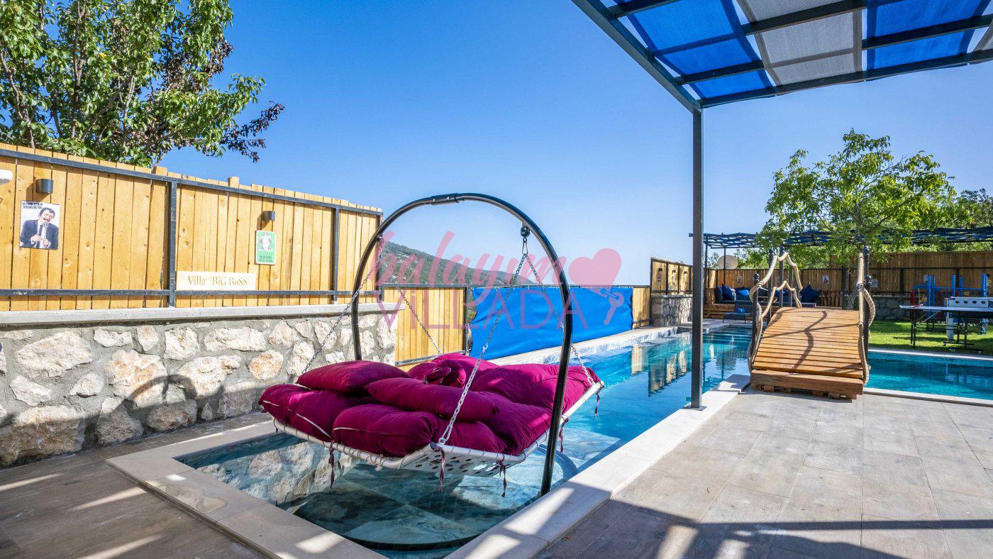 Big Boss, Kalkan İslamlar’da bulunan taş mimarili ile özenle dekore edilmiş , yeşillikler içinde özel muhafazakar havuzlu, masa tenisi, şömine, langırt, çocuklar için düşünülmüş oyun parkı, salıncak, mini futbol kalesi, küçük basket potası, oturma köşkü, tranbolin, masa tenisi, langırt, minyatür kale, havuzda voleybol filesi, tavla, satranç, domino, sauna ve oda içerisinde jakuzi bulunan villamız bölgenin modern villalarından olup muhafazakar balayı çiftine uygun, lüks balayı villasıdır. Villa Big Boss geniş bir bahçe içerisinde yapılmış olup etrafında herhangi bir yerleşim olmadığı için korunaklı bir havuza sahiptir. Not: Villaya giden yolun son 2 km stabilize toprak yoldur.