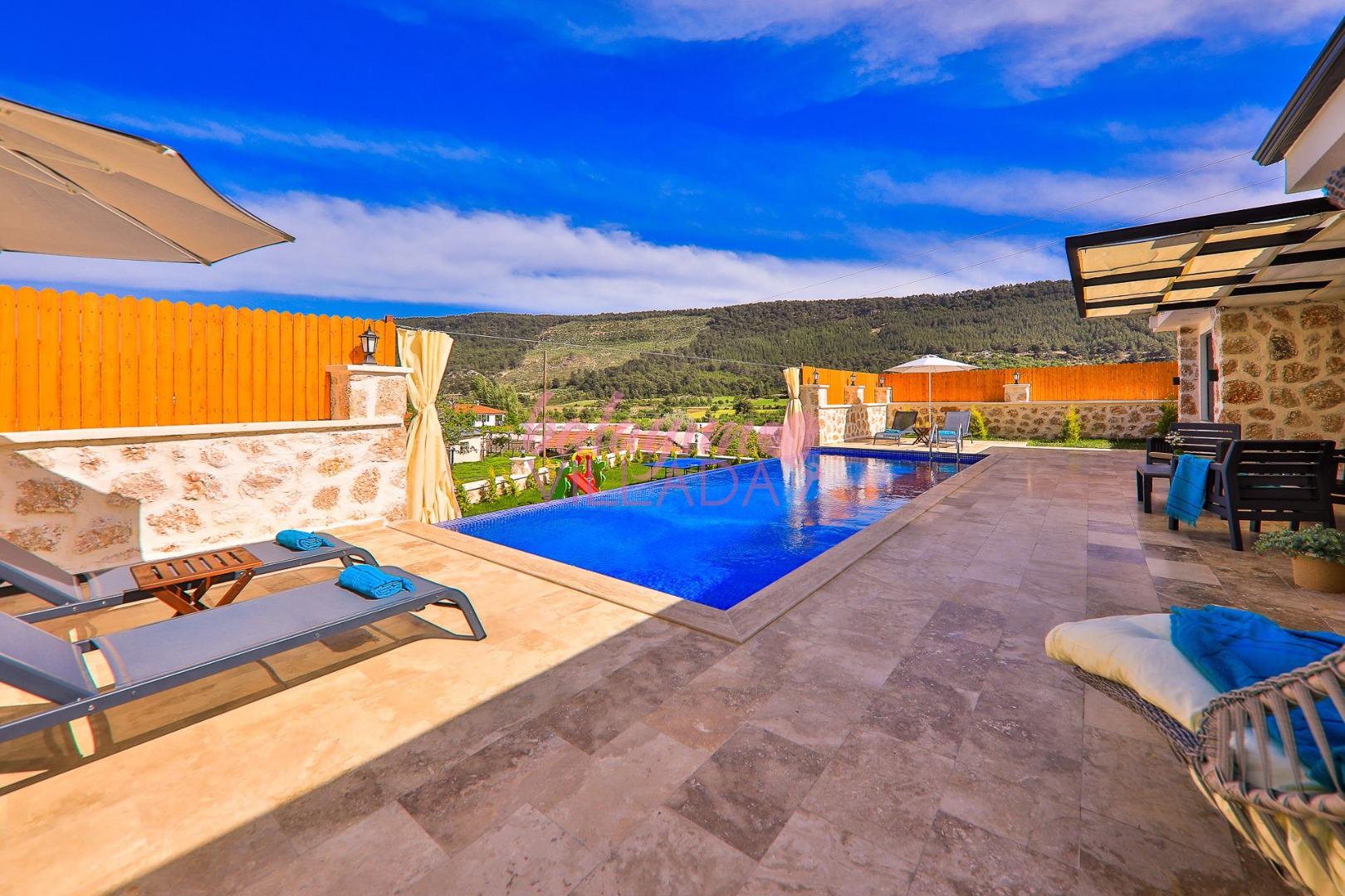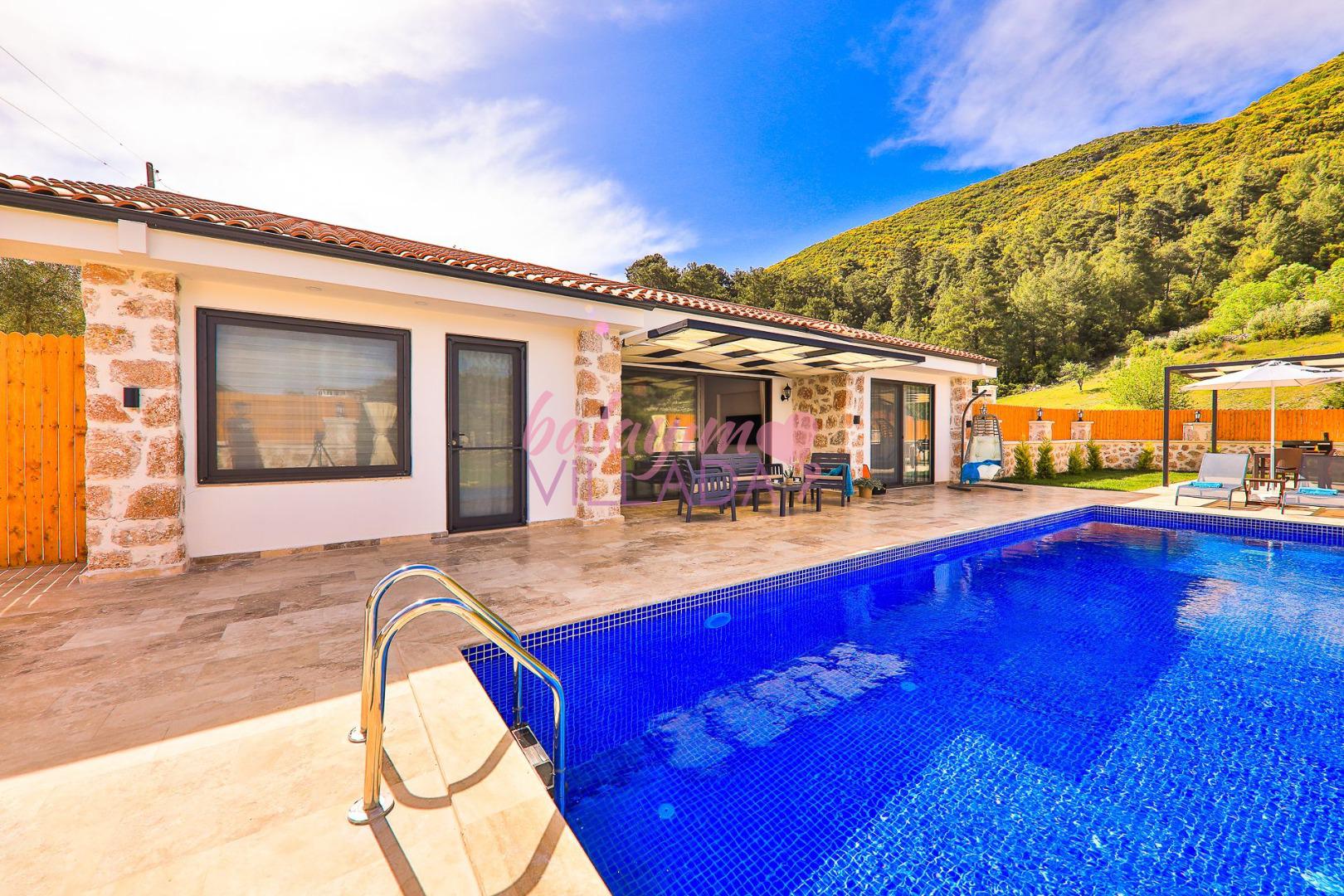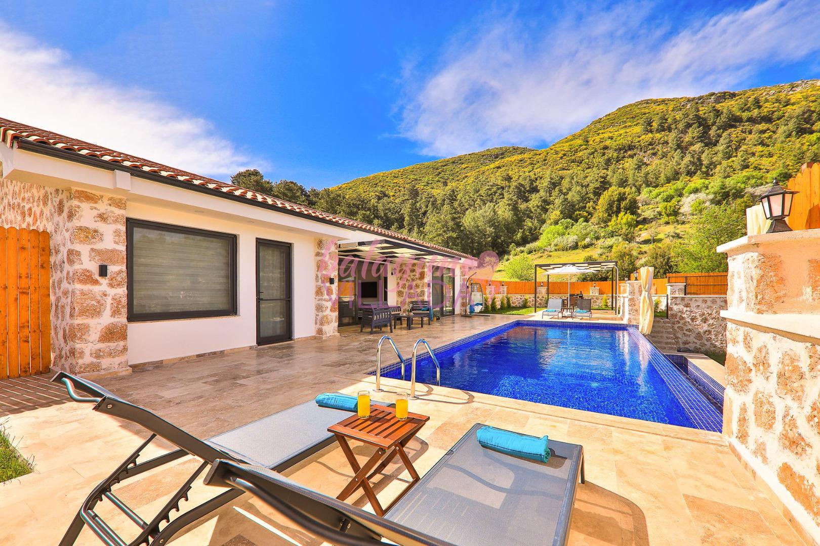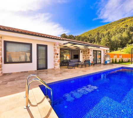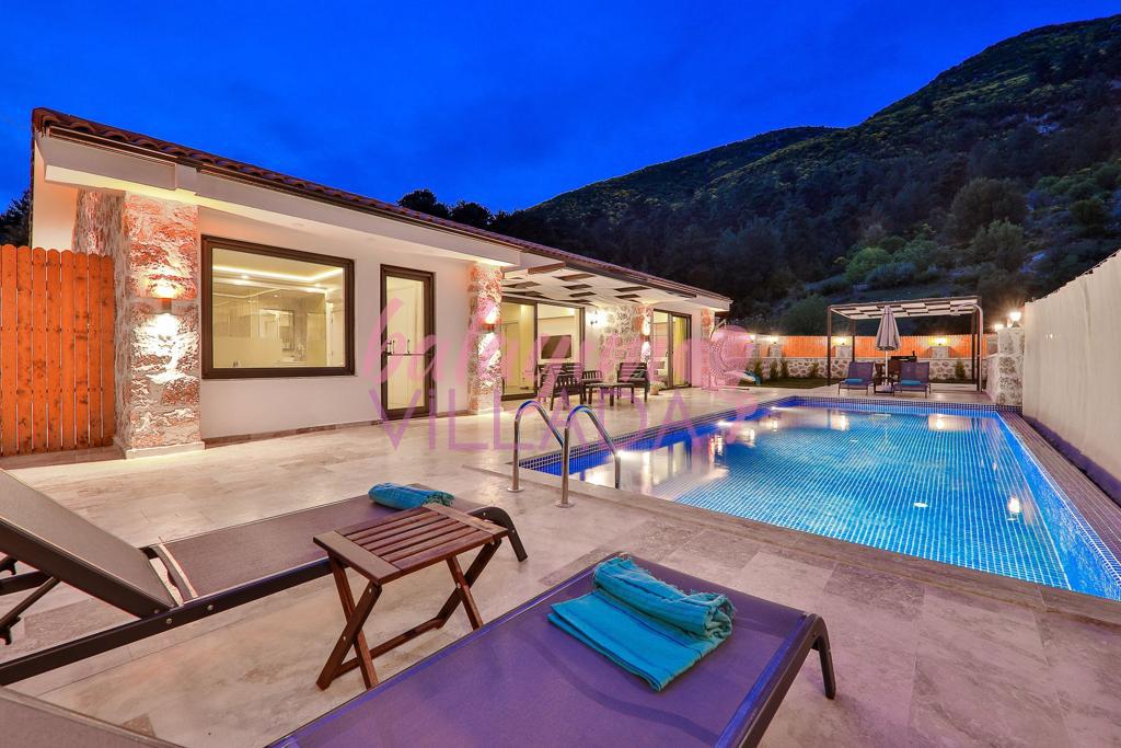 Villa Elçin Kalkan'ın Sarıbelen mevkiinde bulunan, şehrin gürültüsünden uzak bir konumda,2 yatak odasıyla,4 kişilik konaklama kapasitesine sahip,taş mimarisiyle,şık ve ferah bir dizayna sahiptir. Villamız doğa içinde konumlanmış olup siz değerli misafirlerimize gözlerden uzak tatil bir imkanı sunmaktadır. Muhafazakar ailelerin rahatlıkla tercih edebileceği korunaklı havuz bahçe alanı, çocuk oyun alanı, barbekü, oturma grubu, yemek masası gibi seçenekler de yer almaktadır. Geniş bahçesi ve konfor alanı ve tüm şıklığı ile tatilininizi süsleyecek olan Villa Elçin misafirlerini bekliyor.