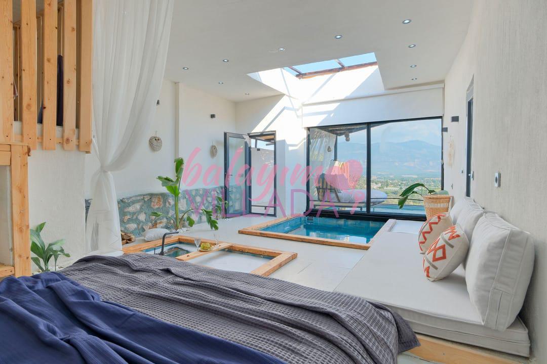 Yatak Odasında Romantik Küvet: Şık yatak odasında yer alan tasarım küvet, tatilinize romantik ve dinlendirici bir dokunuş ekler.
