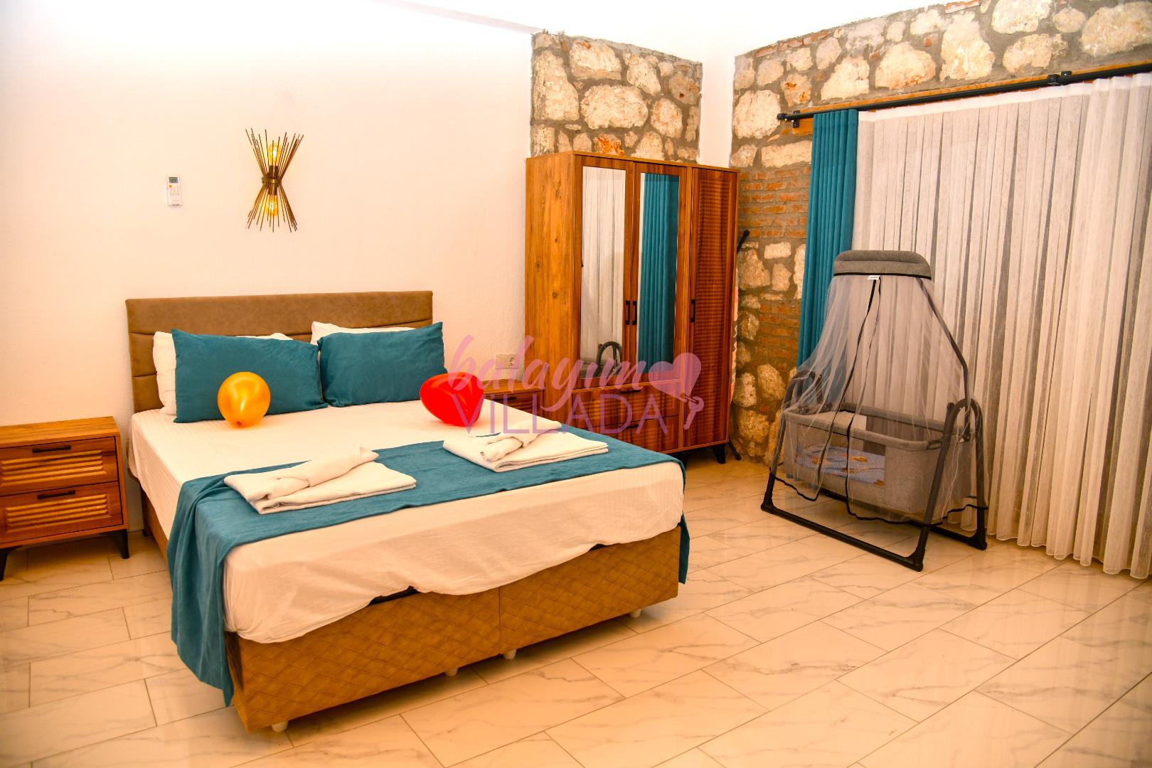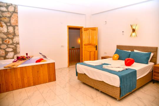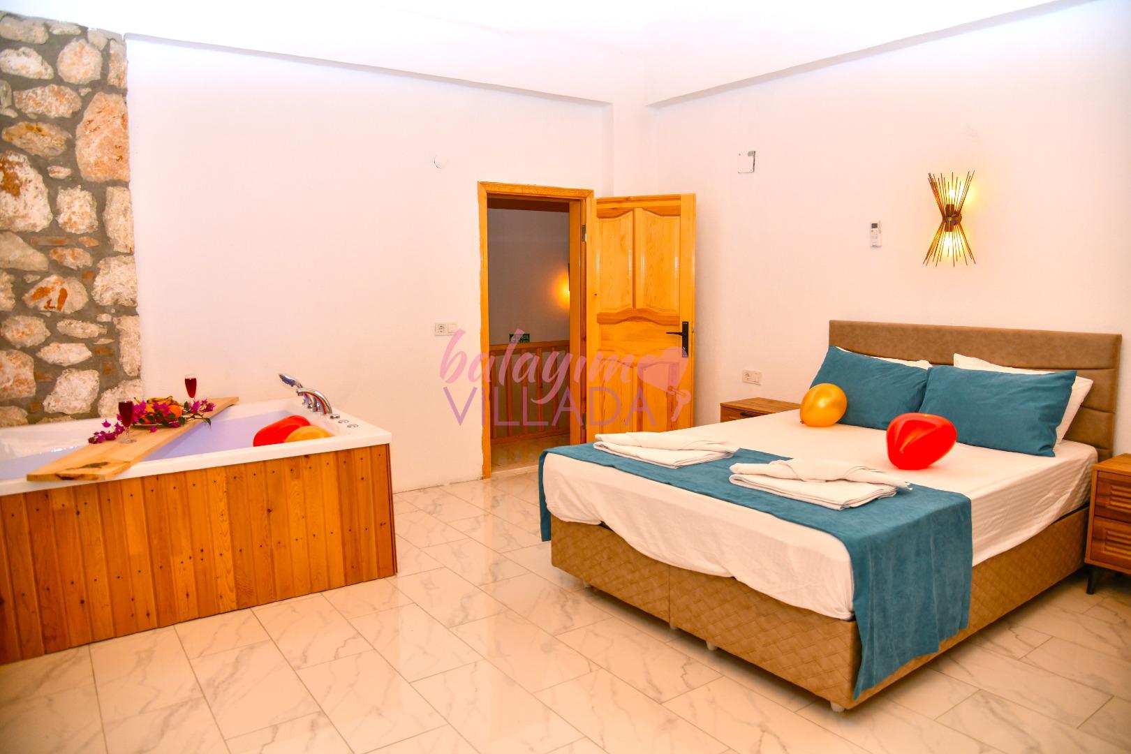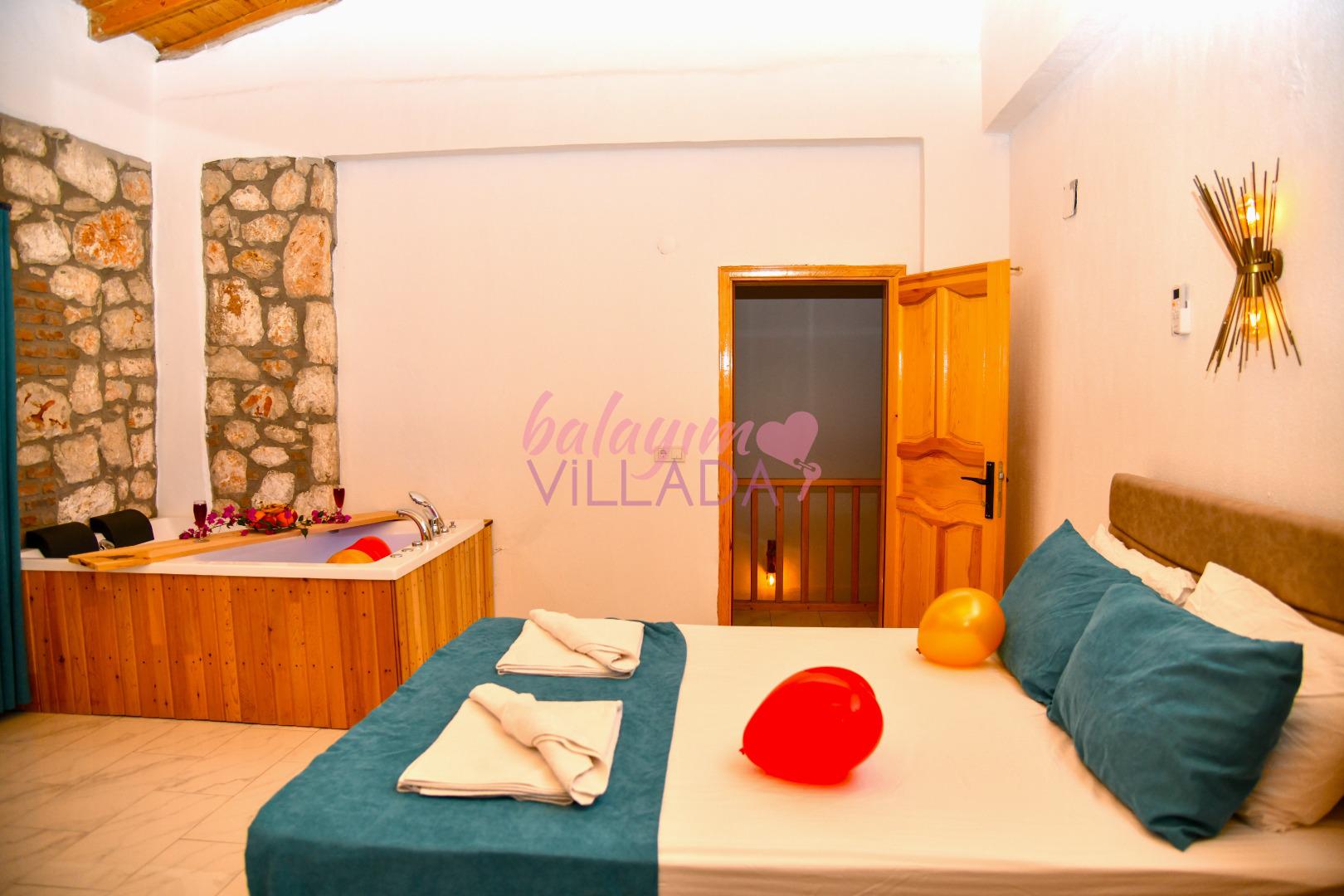 Dinlendirici Jakuzi Keyfi: Ebeveyn yatak odanızda yer alan jakuzi, tatilinize keyifli bir dokunuş katmak için özel olarak hazırlandı.