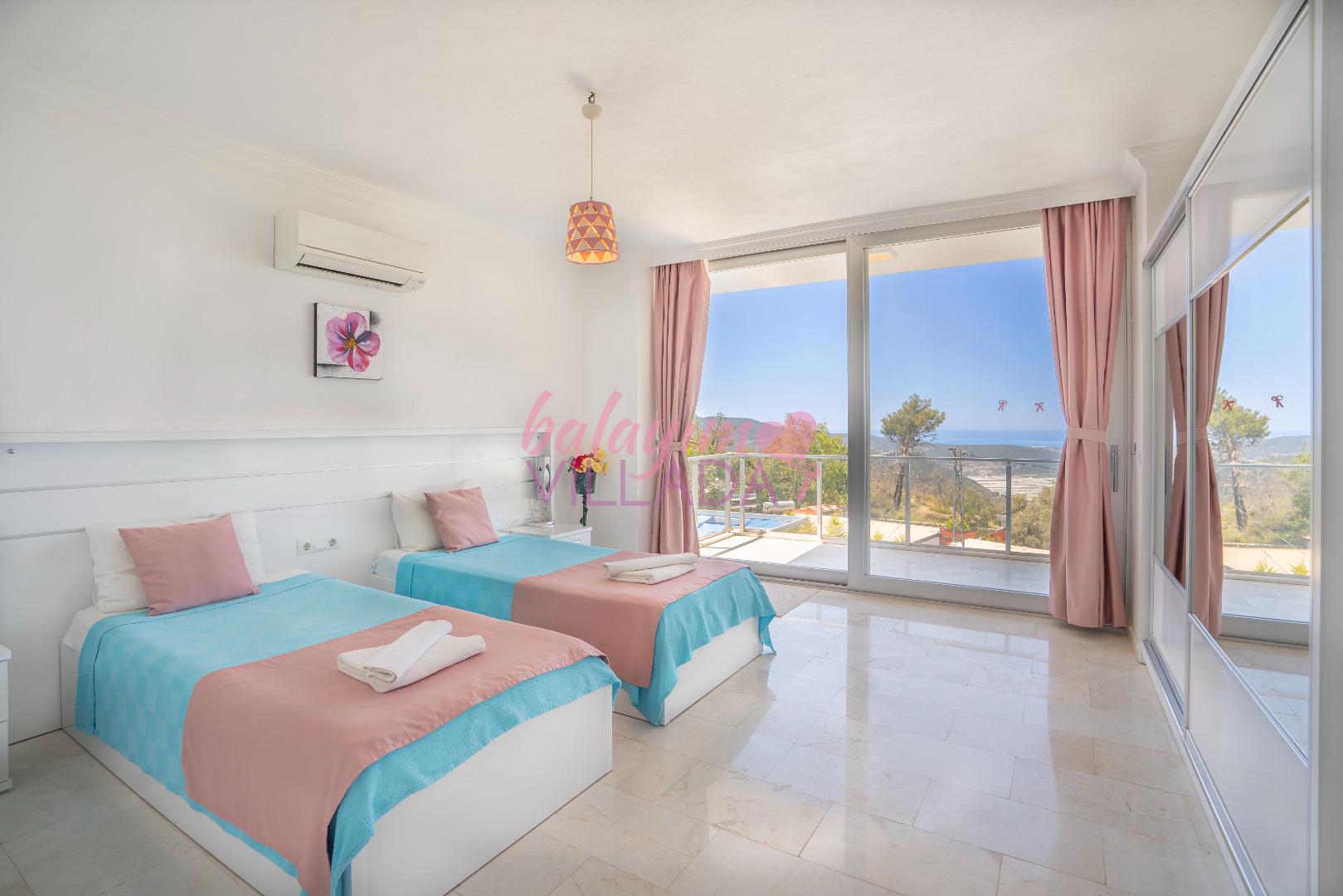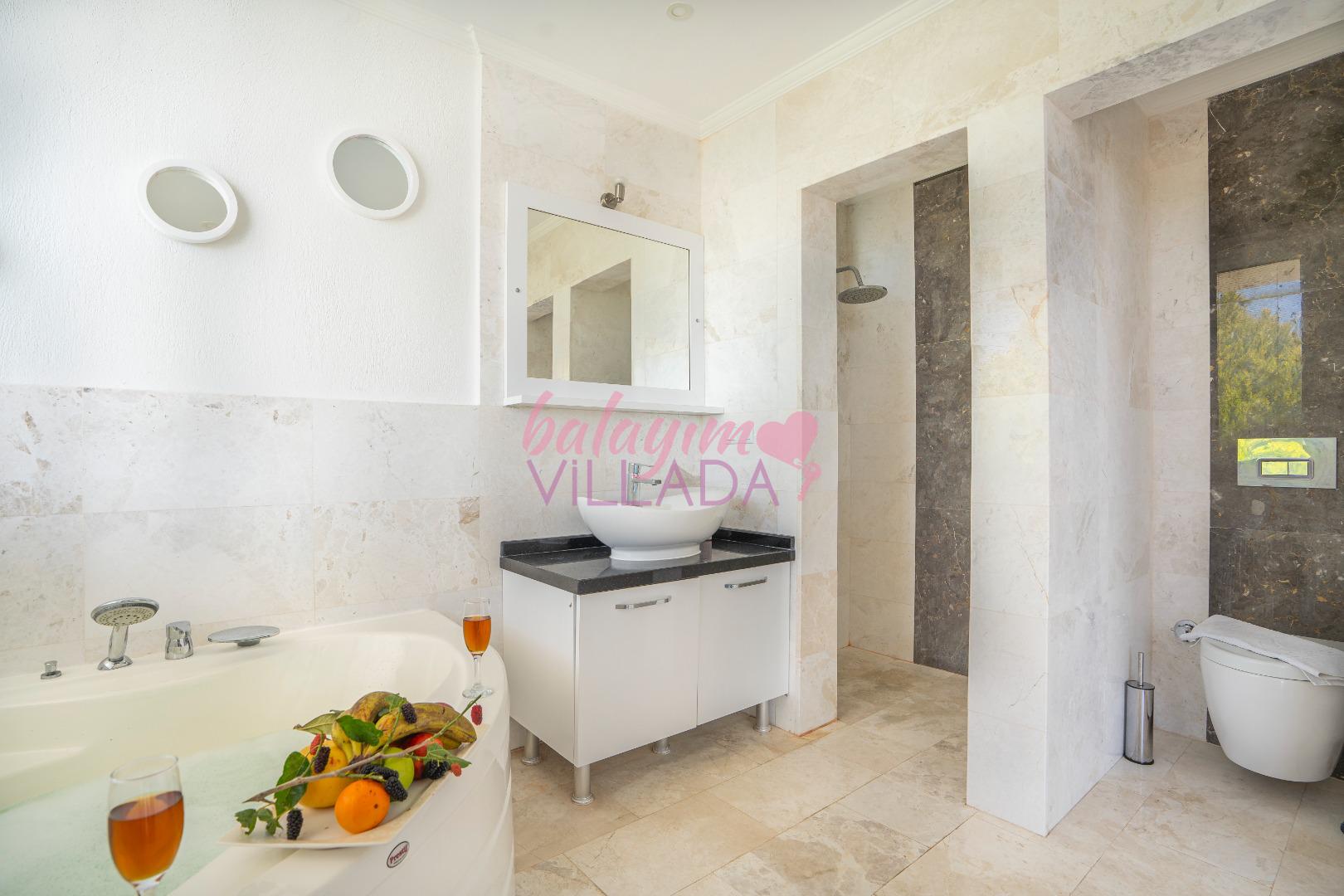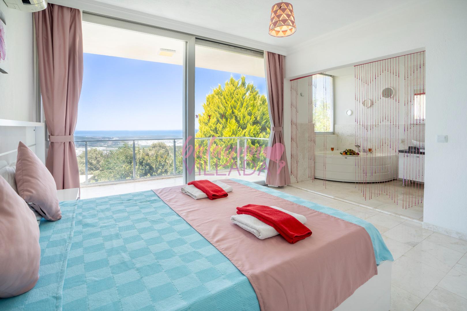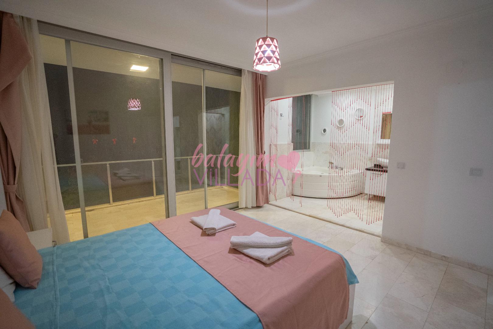 Romantik Jakuzi Keyfi: Şık yatak odasında yer alan lüks jakuzi, tatilinize romantizm ve dinginlik katar.