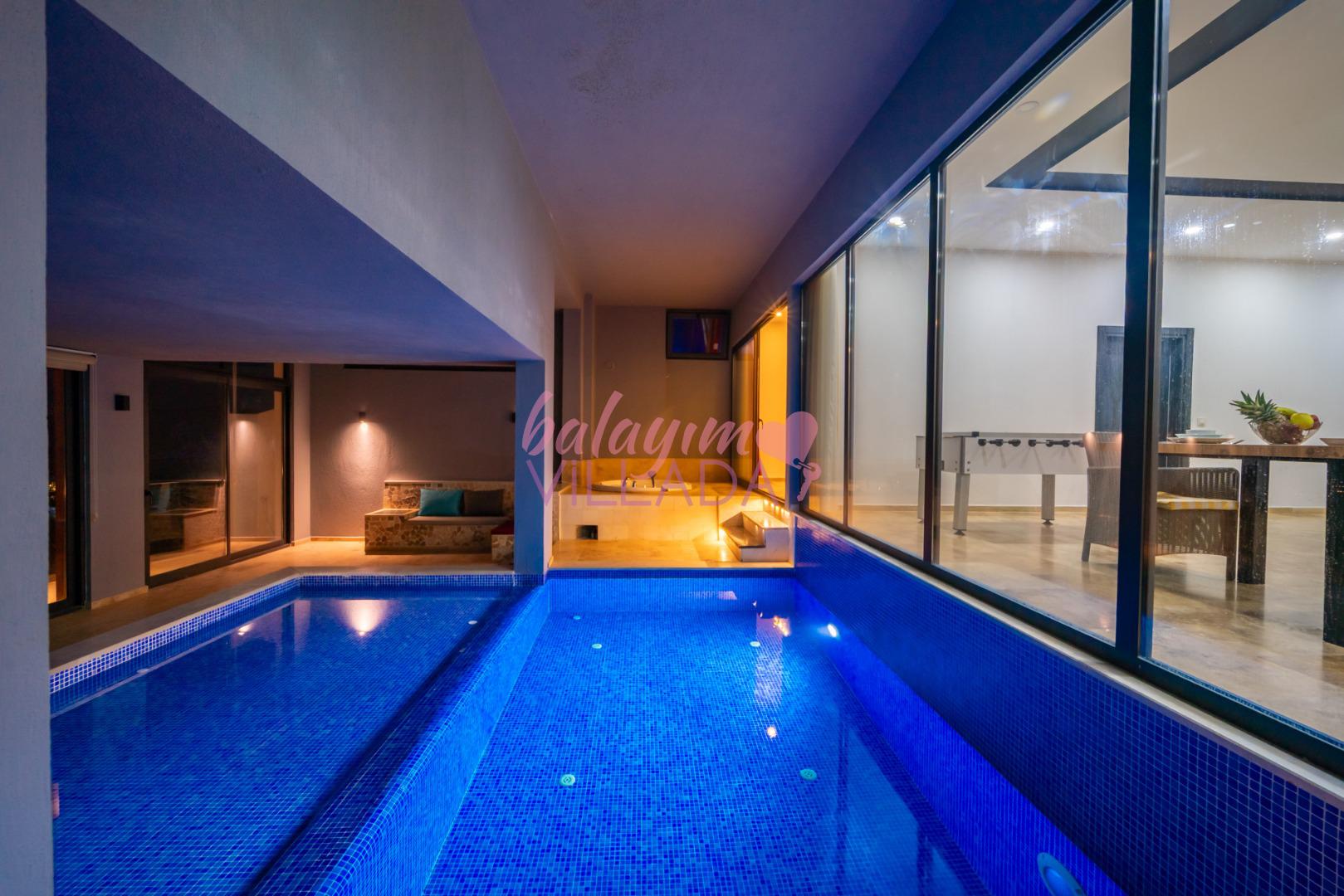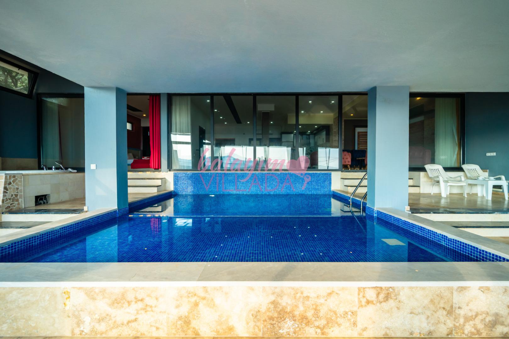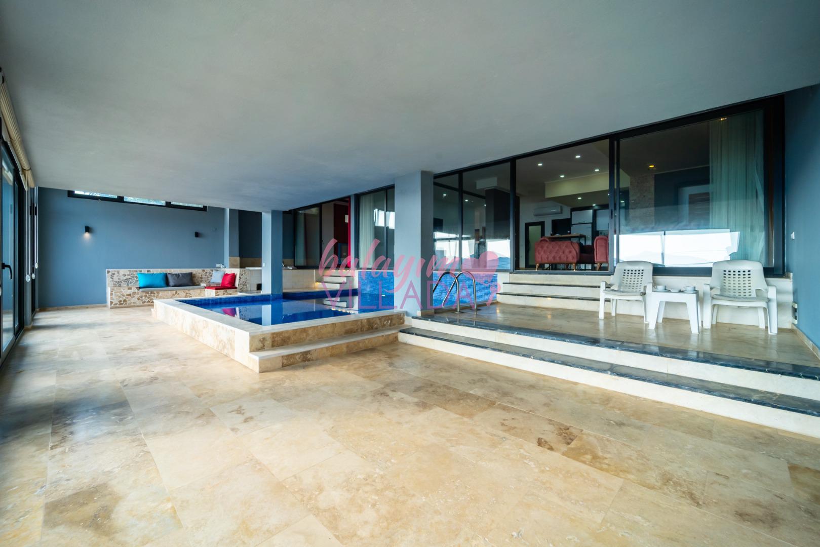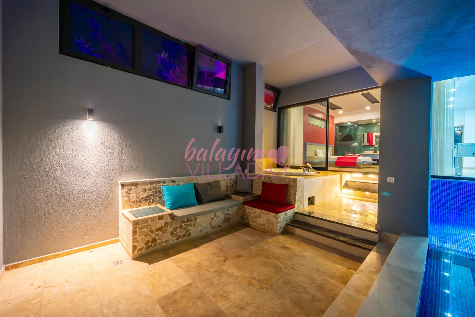 Villa Retro Duo, Kalkan merkezine yakın bir konum olan Kördere’de bulunuyor. Tek yatak odalı villamızda hamam, sauna, jakuzi, langırt, ısıtmalı havuz, sinema odası gibi çiftlerimizin keyifli bir tatil geçirmesi için seçenekler bulunuyor. Harika bir deniz manzarasına sahip olan villamız, balayına çıkmak isteyen çiftlerimiz için özel olarak hazırlandı. Villamızın havuzu iç tarafta bulunmaktadır ve üstü kapalıdır. Kış aylarında da ısıtma özelliği sayesinde keyifli bir tatil imkanı sunar. Villamız gözlerden uzak olmak isteyen çiftlerimiz için de oldukça idealdir.