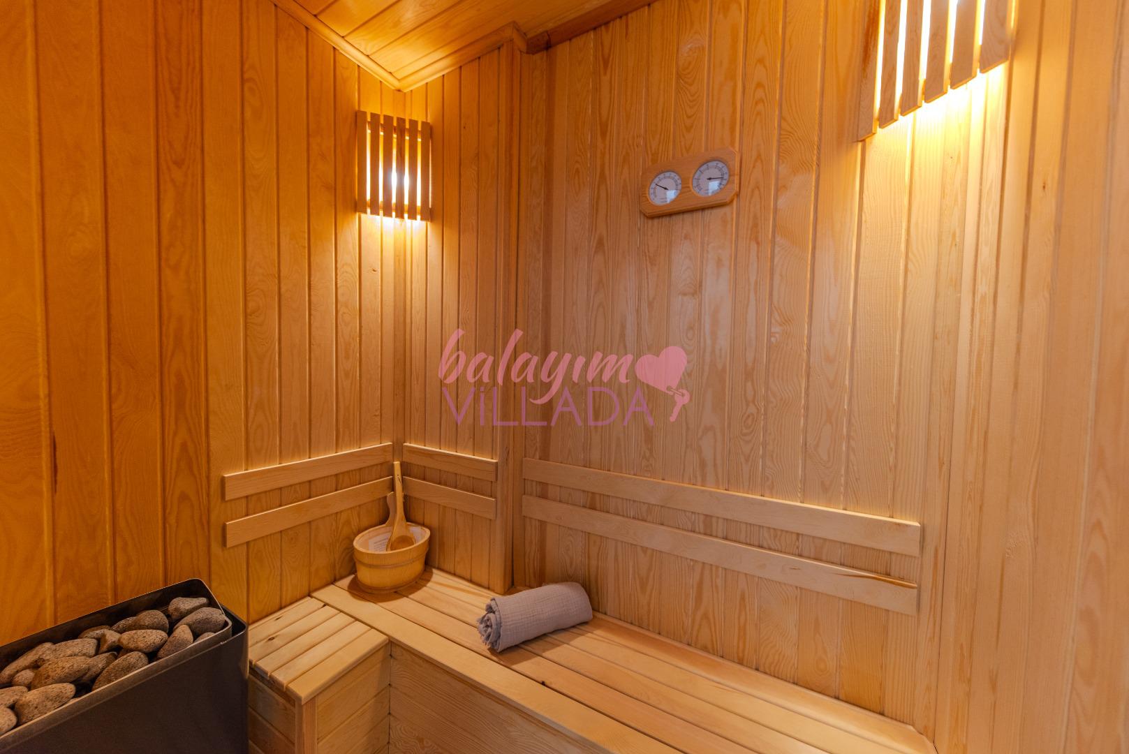 Romantik Detaylar ve Spa: Ebeveyn yatak odasında yer alan şık jakuzi ve oda içi TV keyfiyle kendinizi şımartabilir; villamızda bulunan sauna ile tüm yılın yorgunluğunu üzerinizden atabilirsiniz.